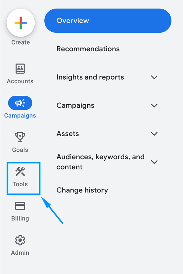 Look at the top navigation bar. Click the βTools and Settingsβ icon. This menu contains account-level resources and campaign tools.