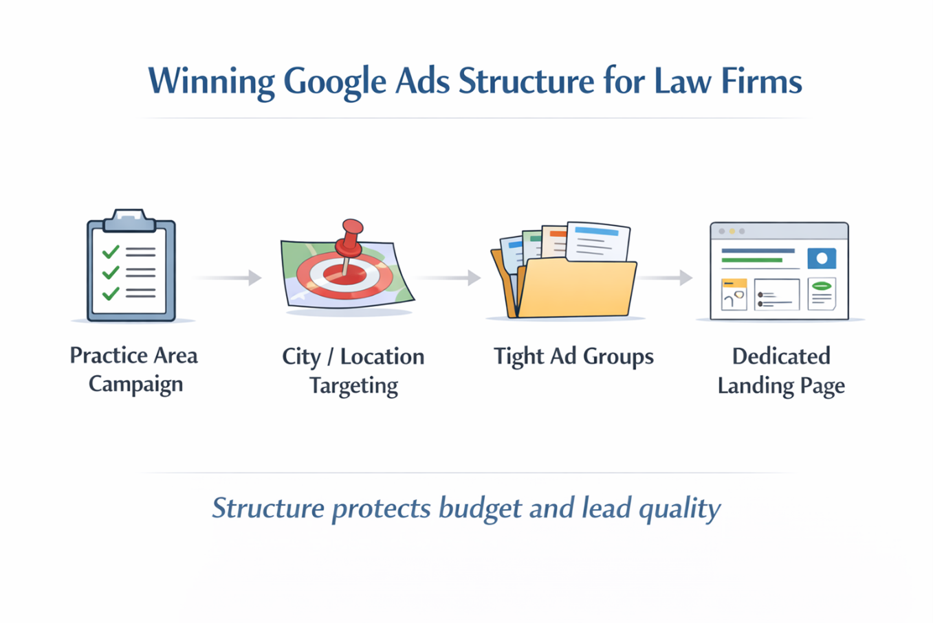For example, personal injury and criminal defence need separate campaigns. Each campaign should control its own keywords and budget. This prevents one practice area from draining another budget.