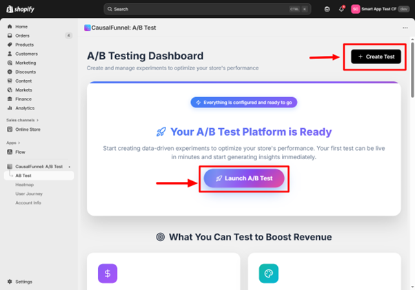 After launch, you are taken to the A B Testing Dashboard. This page becomes your operational center.