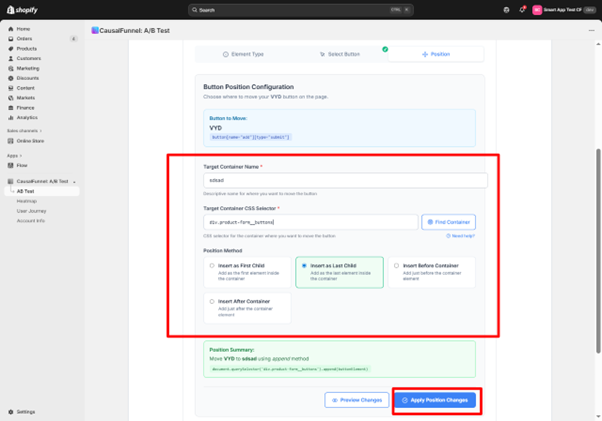 If the experiment involves button placement, you will be taken to a screen that controls where the button moves. This is one of the most powerful parts of element testing because small placement changes have a significant impact on user behavior.