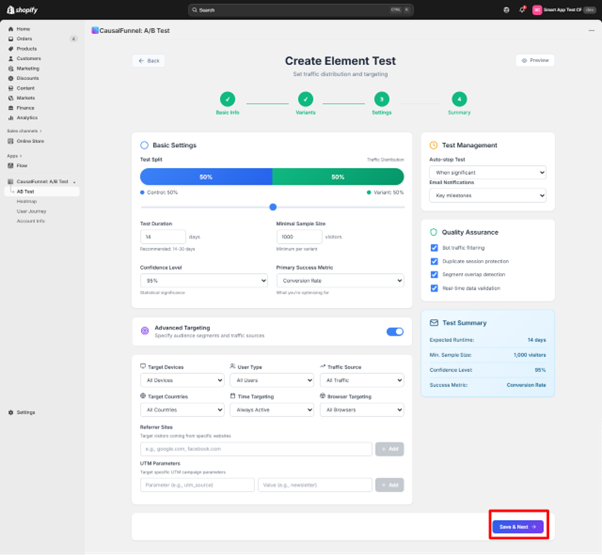 The page link loads the correct environment so the preview can show you the actual element in real time. The selector links the experiment to that element so CausalFunnel can modify it during the test.