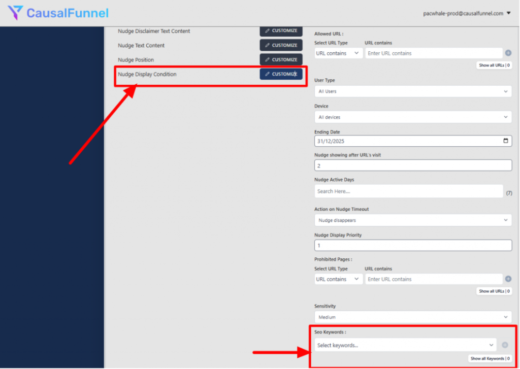 CausalFunnel helps you take SEO beyond rankings by connecting search behavior with real conversion actions. Through its Traffic Optimization β Nudge Display Condition setup, you can target visitors based on the exact keywords they searched for and present them with personalized nudges that encourage immediate action.