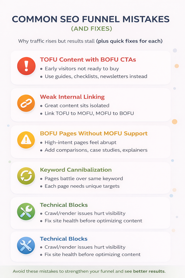 Many SEO strategies fail due to poor funnel alignment. These mistakes appear across industries and often explain why traffic grows but results do not.